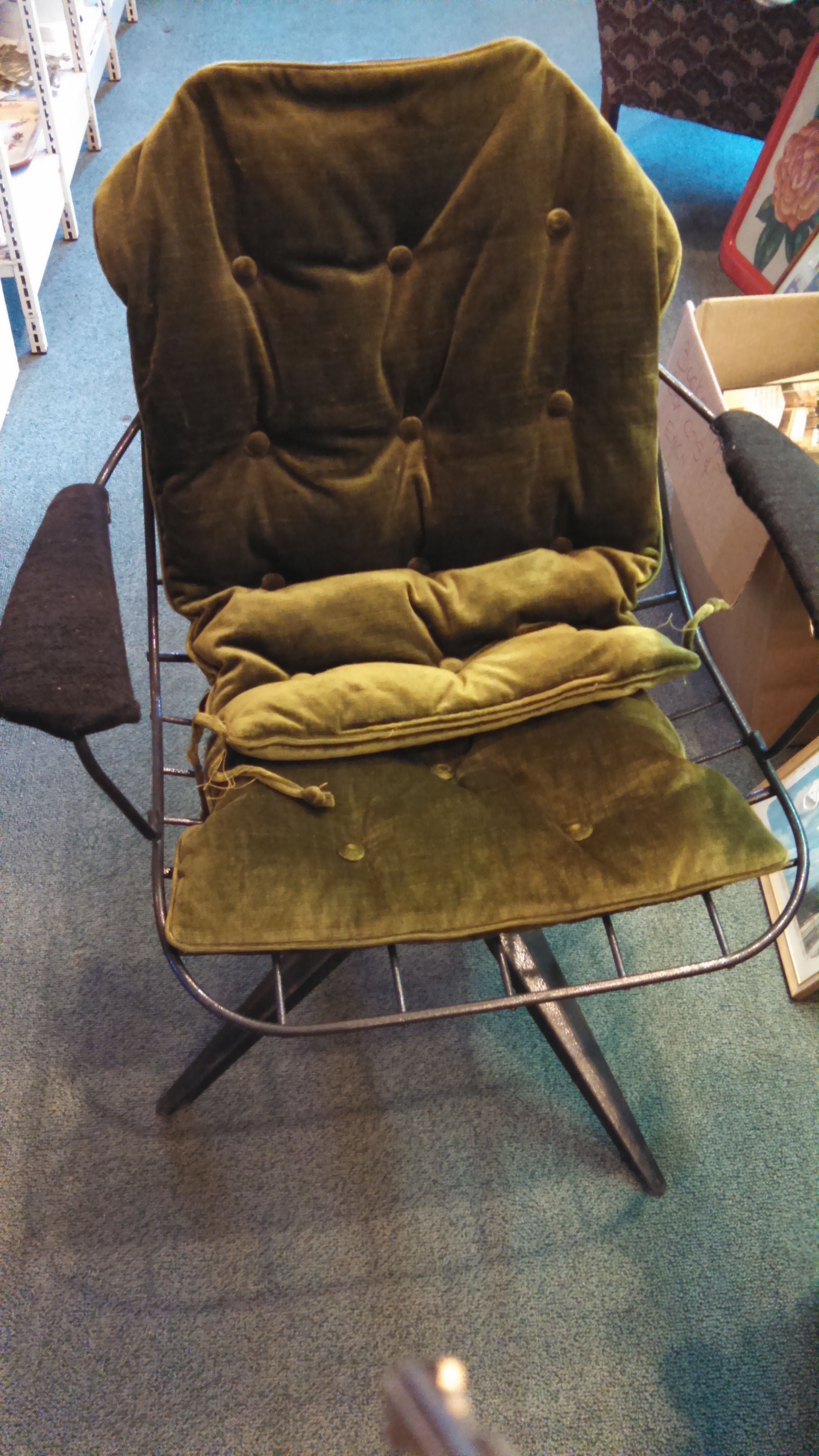 I’ve wanted a vintage wire frame chair for a while now, but gave up on finding one and bought a lounger instead. The other night at an auction I saw a wire chair that looked exactly like what I’d wanted, but unfortunately, it’d already sold. I was pretty dissapointed but took a picture of it anyway, thinking I might find one in the future. Lo and behold, not a week later I found the same exact chair (only with hideous green velvet cushions rather than black leather) at an antique store. I swiftly carried it upstairs from the basement and bought it. My mom, whom I was with at the time and Jason, who saw it get dragged into our house both agreed it was hideous, but I saw potential.